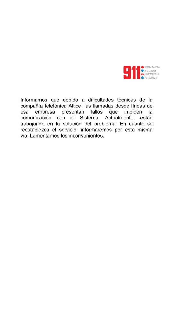 En un comunicado, la Presidencia de la República informa a todos los dominicanos que debido a dificultades técnicas de la compañía Altice, las llamadas desde las línea de esa empresa presentan fallos que impiden comunicación con el 9-1-1. Trabajan en la solución del problema. “Lamentamos los inconvenientes”, concluyó.