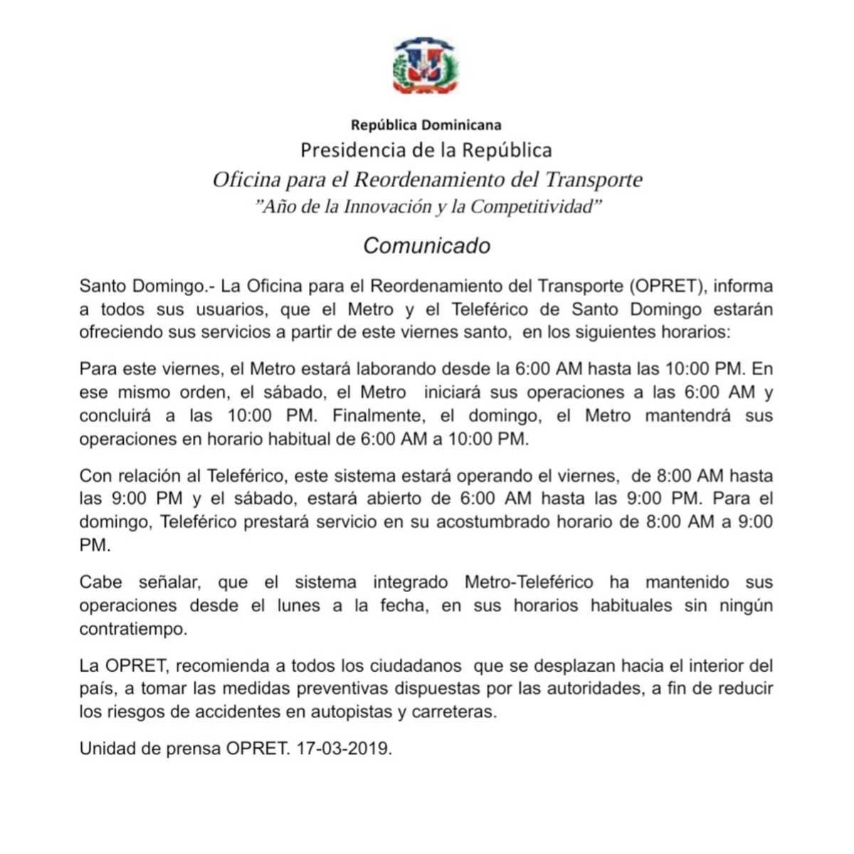 Santo Domingo, República Dominicana.-La Oficina para el Reordenamiento del Transporte (OPRET), informó que en esta Semana Santa, el  Metro laborará en horario normal,  desde la 6:00 am hasta las 10:00 pm.