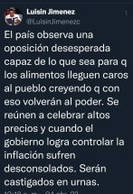 Asimismo, Jiménez dijo que esos políticos de la oposición se reúnen para celebrar altos precios y cando el gobierno logra controlar la infleción sufren desconsolados, por lo que serán castigados en las urnas.