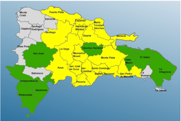 En alerta amarilla están: María Trinidad Sánchez, Puerto Plata, San José de Ocoa, Hermanas Mirabal, Monseñor Nouel, San Pedro de Macorís, Santiago, Santo Domingo, San Cristóbal, La Vega, Monte Plata, Azua, Duarte, Espaillat, Samaná, Distrito Nacional y Peravia.