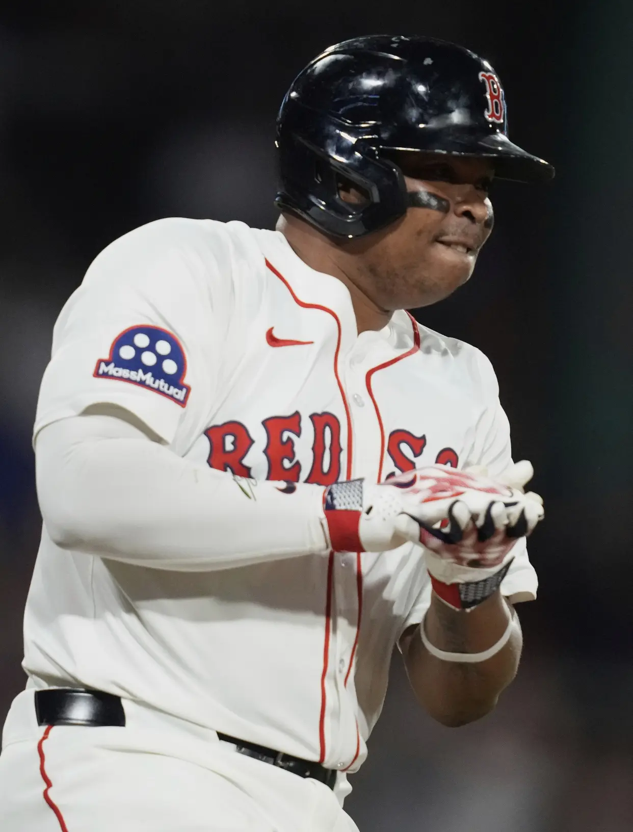 Rafael Devers, de Boston, celebra tras conectar un imparable remolcador contra Minnesota.