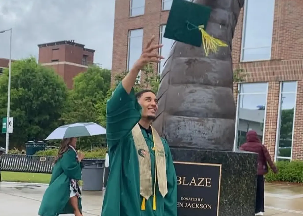 Yaxel Lendeborg, lanza con orgullo su birrete, en señal de su graduación.